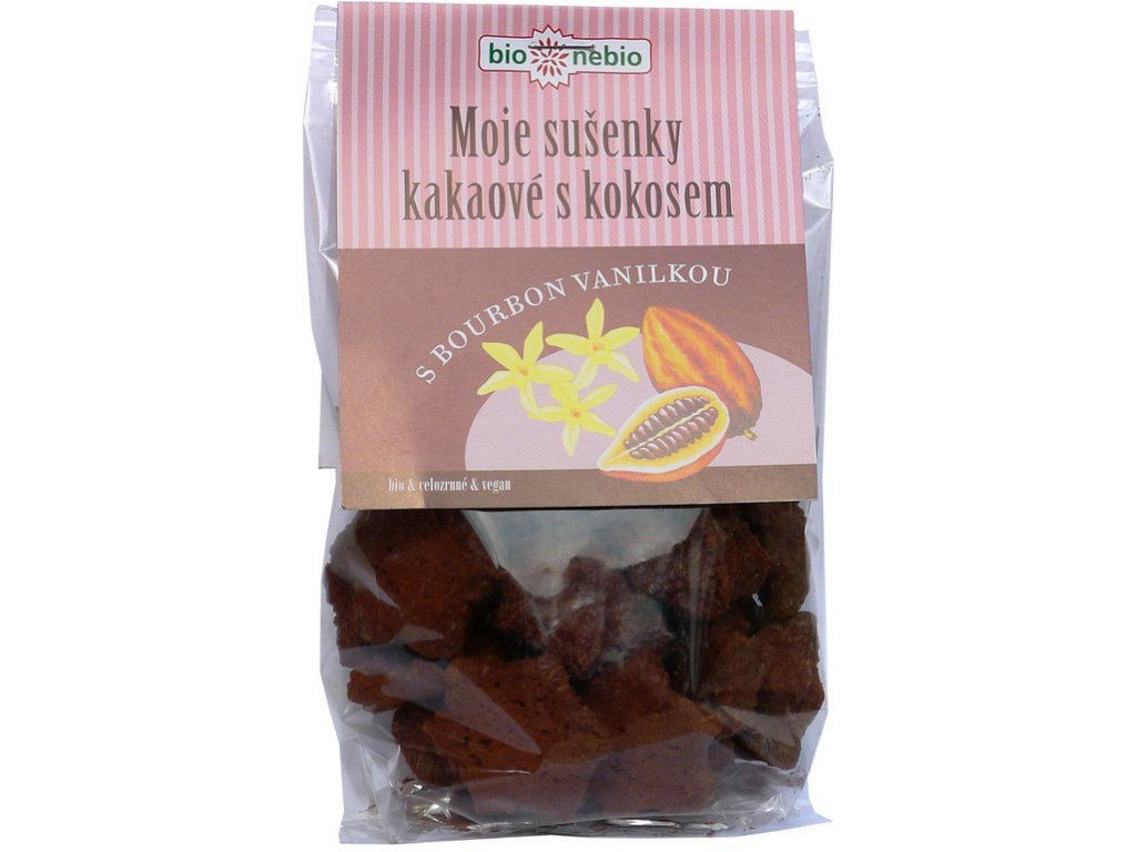 SLOŽENÍ: celozrnná pšeničná mouka* 38 %, přírodní třtinový cukr*, strouhaný kokos* 21 %, kokosový olej*, kakao* 5 %, Bourbon vanilka* 0,1 %, kypřící látka jedlá soda (neboli hydrogenuhličitan sodný). Suroviny označené * pocházejí z kontrolovaného ekologického zemědělství.