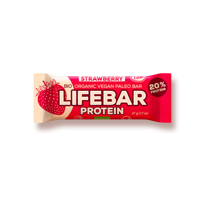 datle*, rýžový proteinový prášek* (16 %), jahodový prášek* (5,5 %), mandle* (5 %), dýňové semínko*, extra panenský olivový olej*, mořská nerafinovaná sůl, mletá vanilka*.* = produkt ekologického zemědělství