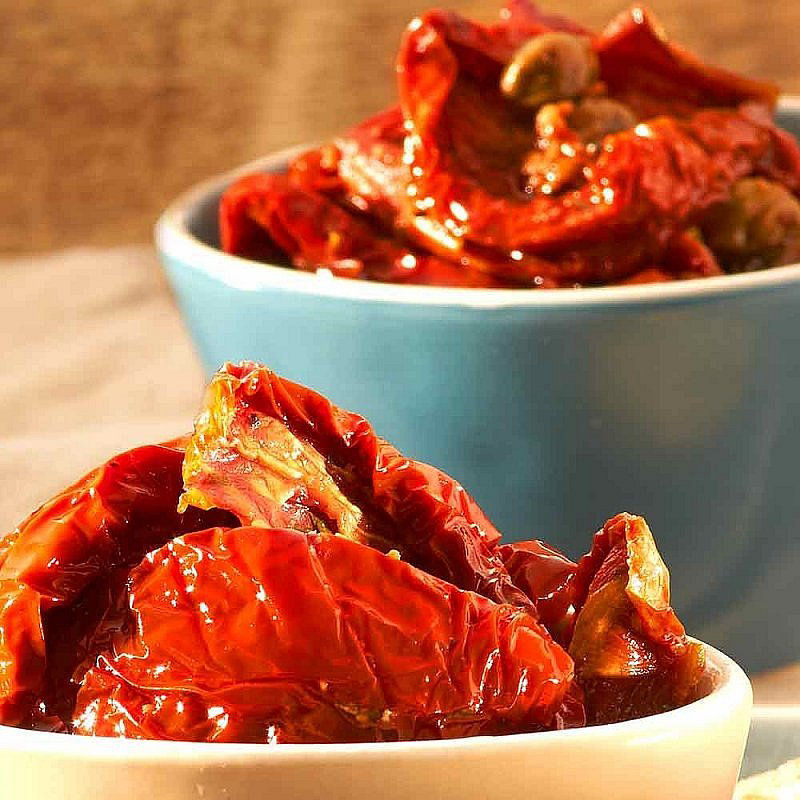 Pod jižními italskými slunečními paprsky jsou zralé, šťavnaté a jasně červené rajčata jemně sušené a konzervované v jemném olivovém a slunečnicovém oleji. Aromatická příchuť kapar, česneku a bazalky zdokonaluje tuto antipastovou tvorbu na lahůdky.