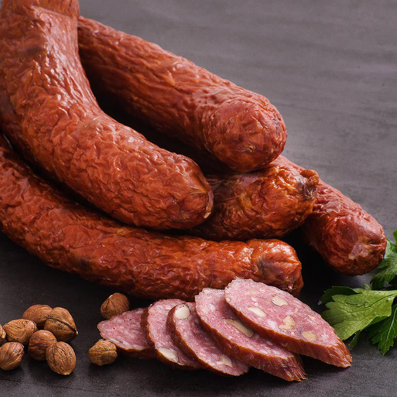 Na 100g hotového výrobku bylo použito 85g vepřového masa a 36g hovězího masa; lískové oříšky 9 % hm. - obsahuje stopy ostatních suchých skořápkových plodů; dusitanová solící směs: jedlá sůl, konzervant: E250; dextróza; koření: