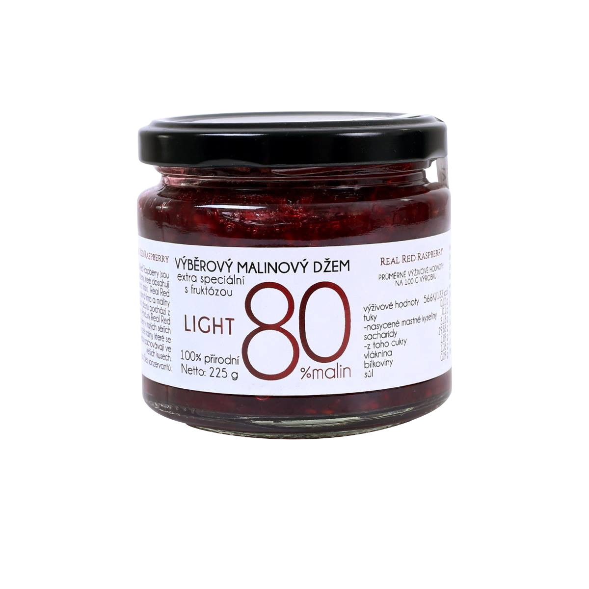 Složení: maliny 80 g, fruktóza, želírující látka pektin, regulátor kyselosti kyselina citrónová, antioxidanty – kyselina askorbová (vitamín C).