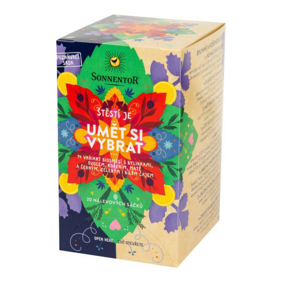 14 druhů biočajů v nálevových sáčcích (Směsi bylinné, kořeněné, s ovocem, se zeleným čajem a maté, bylinná směs s bílým čajem, bylinná směs s černým čajem). *produkt kontrolovaného ekologického zemědělství