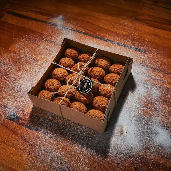 cukr moučka, mouka pšeničná hladká, vlašské ořechy, máslo čerstvé, margarín (rostlinné oleje a tuky (kokosový a řepkový – proměnlivý poměr), voda, emulgátor (slunečnicový lecitin, mono a diglyceridy mastných kyselin, estry polyglycerolu mastných kyselin), sladká sušená syrovátka, aroma, regulátor kyselosti kyselina citrónová), regulátor kyselosti: kyselina citrónová, aroma), piškoty mleté (pšeničná mouka, vejce, cukr), kakaový prášek, alkohol.