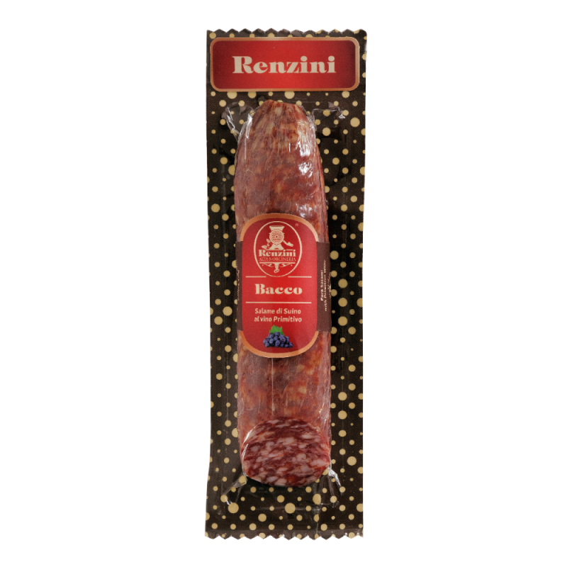 Složení: vepřové maso, sůl, víno Primitivo Puglia IGT, dextróza, přírodní aromata, koření, antioxidanty (E301), konzervanty (E250, E252).Nejedlé střívko.