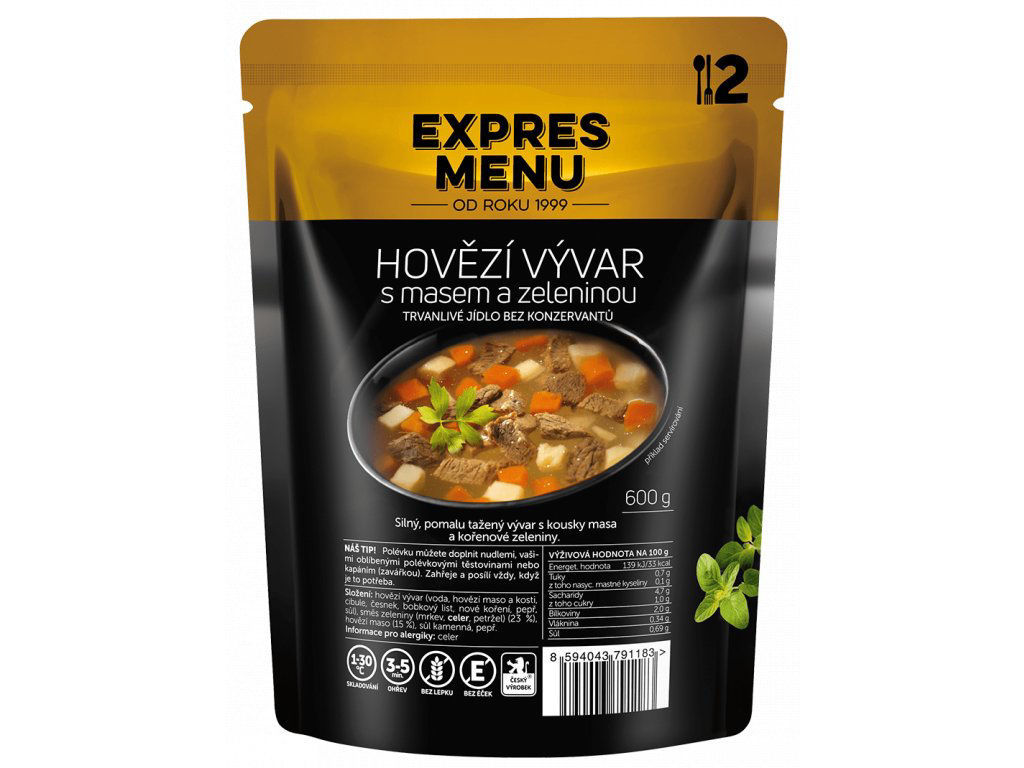 hovězí vývar (voda, hovězí maso a kosti, cibule, česnek, bobkový list, nové koření, pepř, sůl), směs zeleniny (mrkev, celer, petržel) (23 %), hovězí maso (15 %), sůl kamenná, pepř.