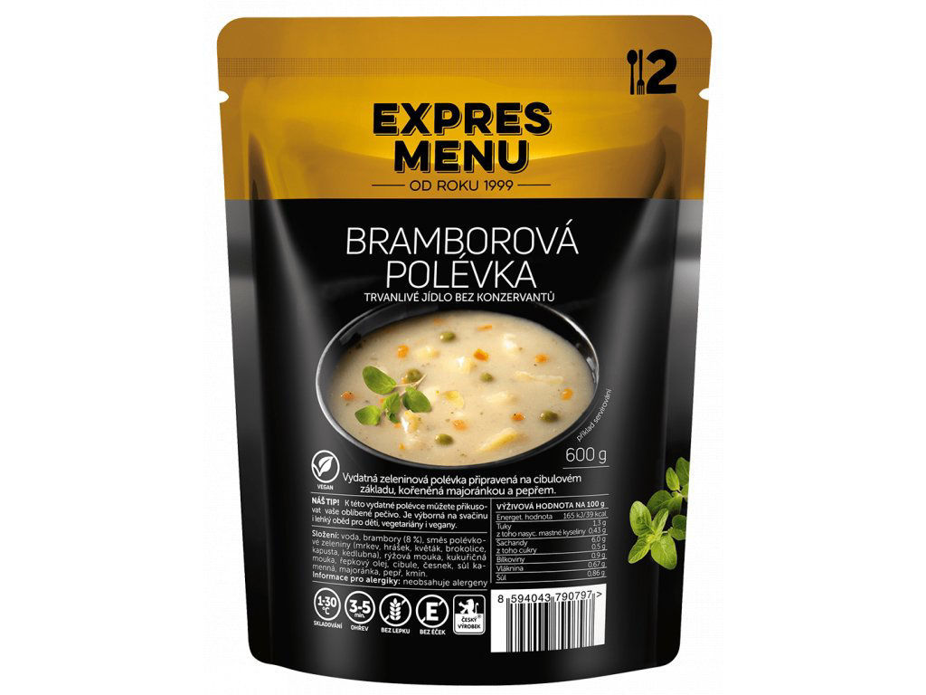 voda, brambory (8 %), směs polévkové zeleniny (mrkev, hrášek, květák, brokolice, kapusta, kedlubna), rýžová mouka, kukuřičná mouka, řepkový olej, cibule, česnek, sůl kamenná, majoránka, pepř, kmín.