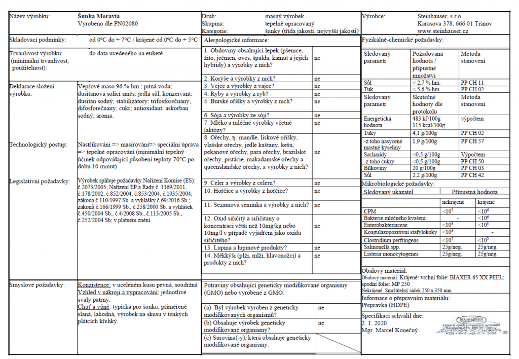 Vepřové maso 95%, pitná voda, dusitanová solící směs: jedlá sůl, konzervant: dusitan sodný, sacharóza, stabilizátory: trifosforečnany, difosforečnany, zahušťovadlo: guma Euchema, antioxidant: askorban sodný, aroma