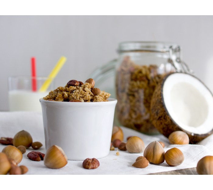 Složení: ovesné instantní vločky 50 %, třtinový cukr, ječný sladový výtažek (ječný slad, pitná voda), ovesné pukance, za studena lisovaný řepkový olej, loupaná slunečnicová semínka, pražené lískové ořechy 5 %, směs ořechů v různém poměru 12% (jádra kešu ořechů, jádra lískových ořechů, pekanové ořechy, jádra mandlí, sušený kokos).