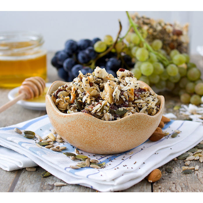 Složení: kokosové plátky 24%, rozinky 18% (rozinky, slunečnicový olej), směs ořechů v různém poměru 10% (mandle natural, kešu), směs semínek v různém poměru 34% (slunečnice, chia, sezam, dýně, konopí neloupané), med, jablečný koncentrát a za studena lisovaný řepkový olej.