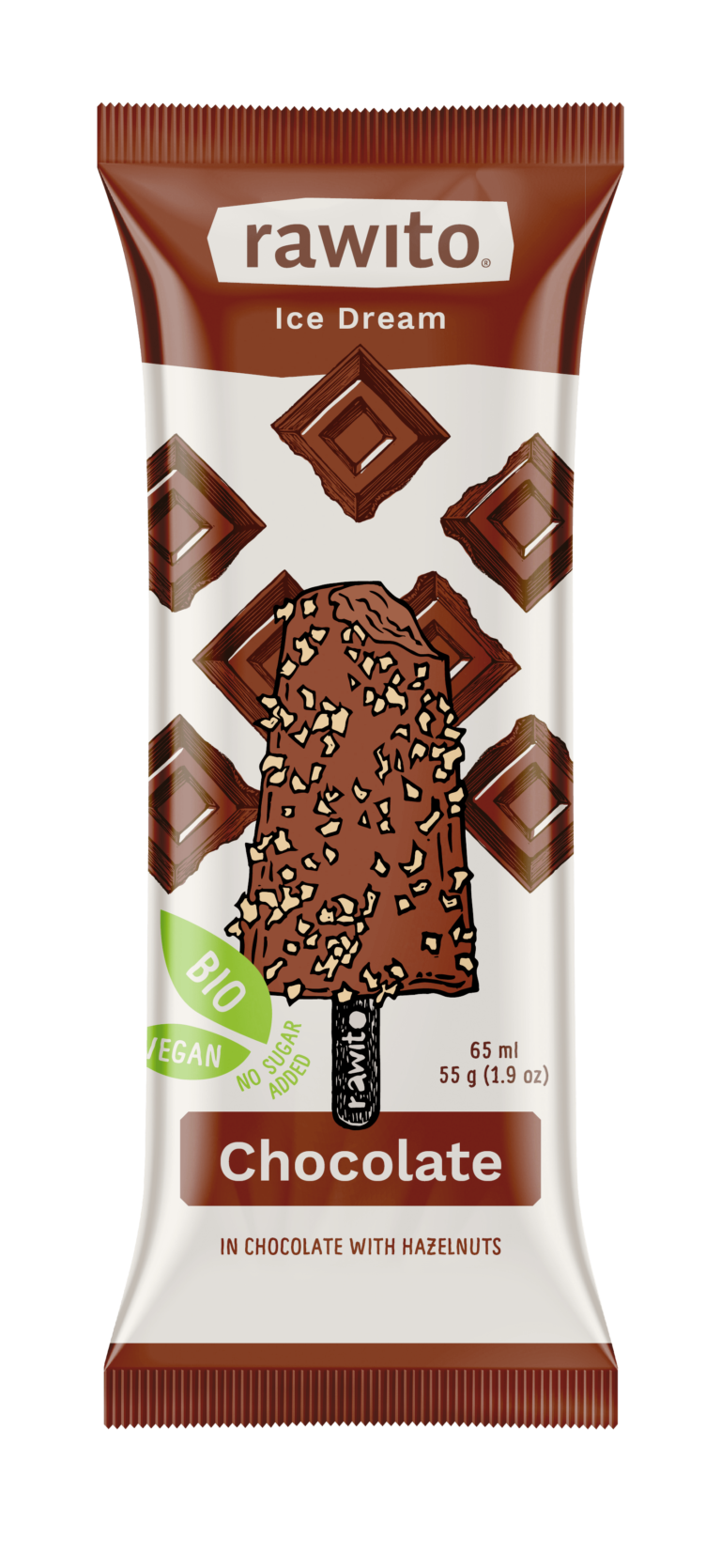 Čokoládová raw zmrzlina – neuvěřitelně plná chuť čokolády. Zalitá v čokoládě s posypem lískových ořechů.