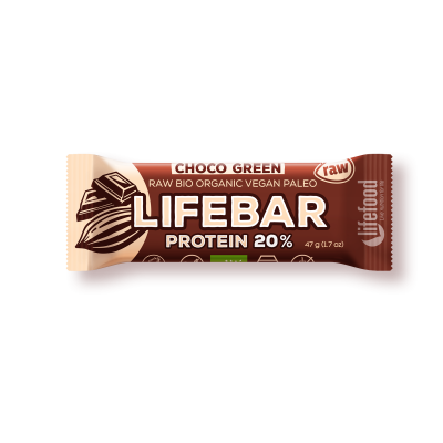 datle* (45 %), mandlová pasta*, rýžový proteinový prášek* (14 %), raw čokoláda* (11 %; kakaový prášek nepražený*, kakaová hmota*, nepražené kakaové boby*, obsah kakaové sušiny 100 %), mandle*, dýňové semínko*, extra panenský olivový olej*, sladkovodní řasa spirulina* (Arthrospira platensis) (0,5 %), mletá vanilka*.