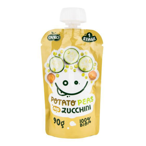 Zelenina* 69 % (brambory* 31,5 %, hrášek* 22,5 %, cuketa* 15 %), voda. Sterilované. *produkt kontrolovaného ekologického zemědělství