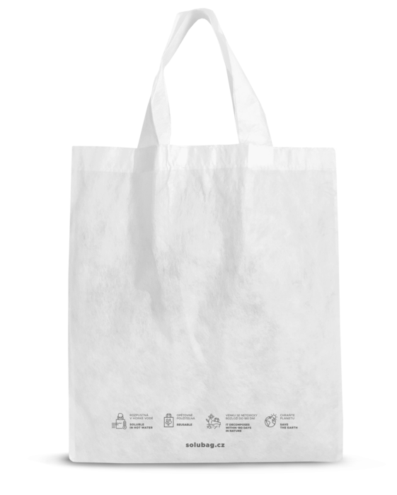Praktická taška z netkané textilie (vytvořená podle modelu populárních látkových tašek). Vhodná do ruky i přes rameno, skvělá pro všechny druhy zboží. Slouží zákazníkovi opakovaně. Po dosloužení ji sám zákazník jednoduše a ekologicky zlikviduje rozpuštěním v horké vodě nebo vyhodí do směsného odpadu.