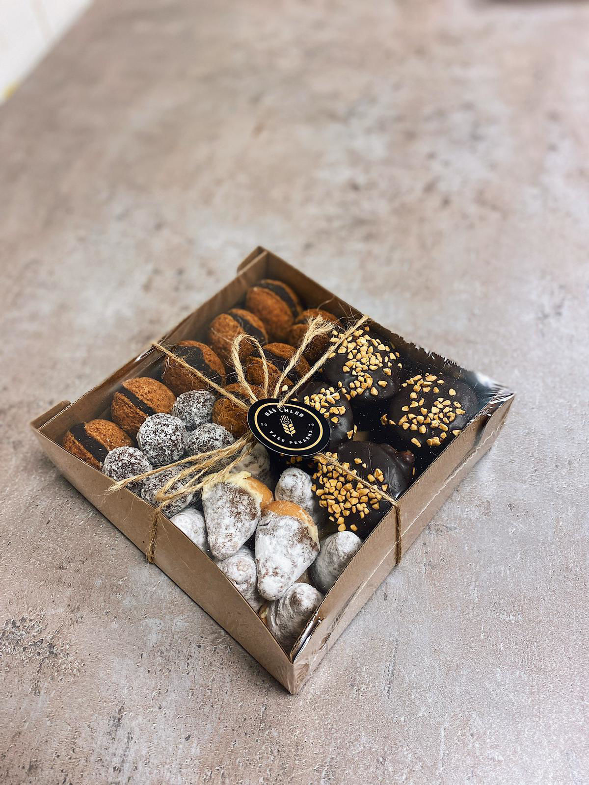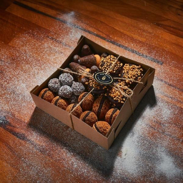 cukr, mouka pšeničná, máslo čerstvé, vlašské ořechy, margarín Prémium (rostlinné oleje a tuky neztužené (kokosový , řepkový), voda, emulgátory (slunečnicový lecitin, mono a diglyceridy mastných kyselin, estery polyglycerolumastných kyselin), sladká sušená syrovátka, aroma, regulátor kyselosti: kyselina citronová), kokos srouhaný, piškoty mleté (pšeničná mouka, vejce, cukr), margarin krémový (rostlinné tuky a oleje (kokos, řepka v proměnlivém hmotnostním podílu), rostlinný tuk zcela ztužený (kokos), pitná voda, emulgátor (mono a digliceridy mastných kyselin z jedlých tuků, slunečnicový lecitin), jedlá sůl (0,1%), regulátor kyselosti: kyselina citrónová, aroma, barvivo: beta karoten), poleva kakaová 15%(cukr, kakaový prášek, sušená syrovátka, emulgátor (sojový lecitin), aroma), voda, alkohol, karamelová rýže (pufovaná rýže 50%, cukr 50%), kakao, vaječná melanž (celá vejce bez skořápek), vaječný žloutek (skořápková vejce, tekutý vaječný žloutek pasterovaný, voda), náplň červený rybíz (cukr, ovocný protlak (červený rybíz 49%), kyselina citrónová, želírující látka (pektiny), přírodní aróma, voda), cukr vanilínový (cukr krupice, ethylvanilin), pšeničný škrob, mléko sušené odstředěné.