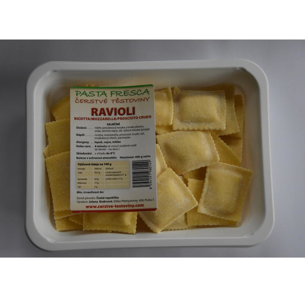 Složení: 100% semolinová mouka z tvrdé pšenice, voda, čerstvá vejce, sůl, rýžová mouka (posyp), náplň (ricotta, prosciuto crudo, mozarella, sůl, muškátový ořech, parmazán).