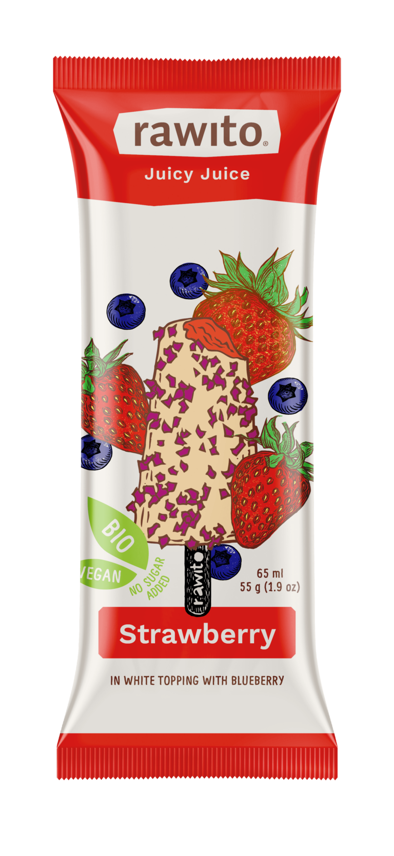 Raw zmrzlina s jahodovou příchutí v bílé polevě s borůvkami
