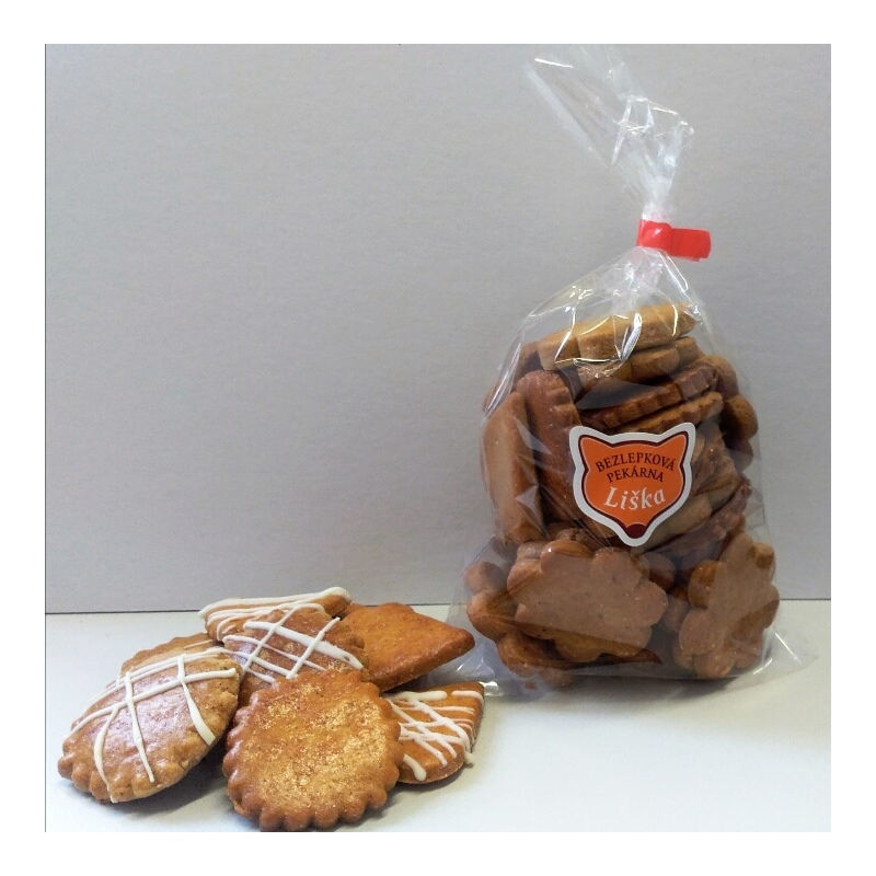 Složení: bezlepková směs (pšeničný deproteinovaný škrob, rýžová mouka, sójová mouka), moučkový cukr, med, vejce, máslo, sušené vaječné žloutky, bramborový škrob, stabilizátory (xanthan, guma tara), jedlá soda, perníkové koření, skořice, jedlá sůl, aroma.