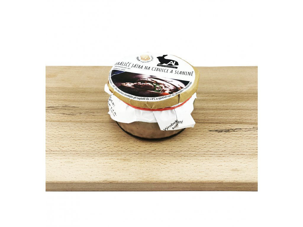 Složení: králičí játra, vepřový ovar, slanina, sádlo, cibule, koření, sůl.