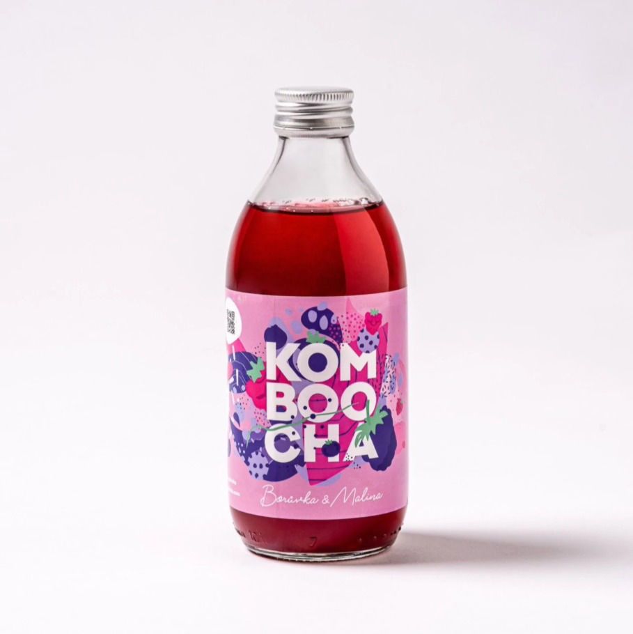 SLOŽENÍ: pitná voda, *kombuchová kultura, *výluh ze zeleného čaje, *třtinový cukr, *maliny, * borůvky. (*produkt ekologického zemědělství)