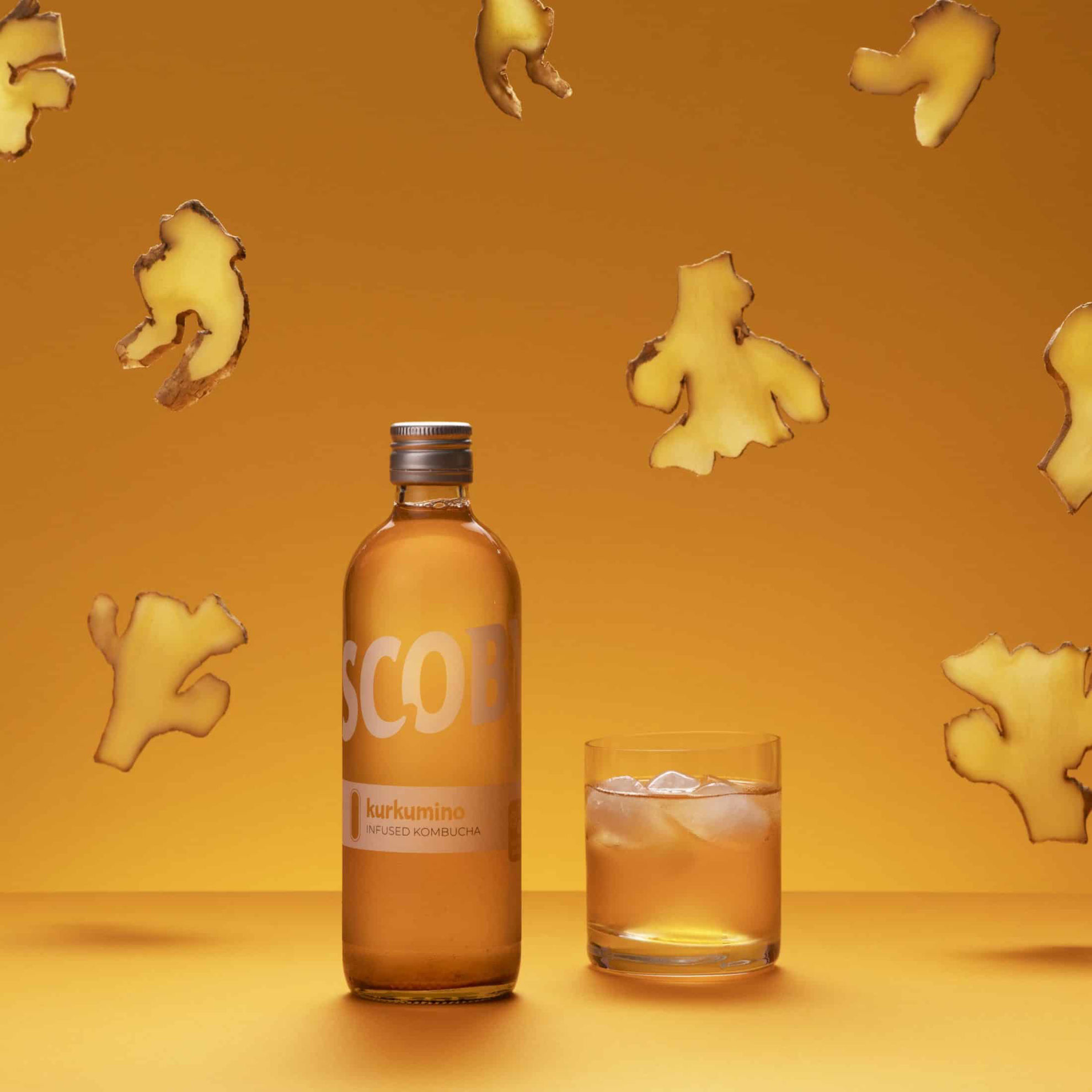 SCOBY živá kombucha (zelený čaj, pitná voda, kultivované kolonie bakterií a kvasinek, třtinový cukr), fermenotováno s vymačkanými pomeranči a za studena lisovanými šťávami z kurkumy a zázvoru.