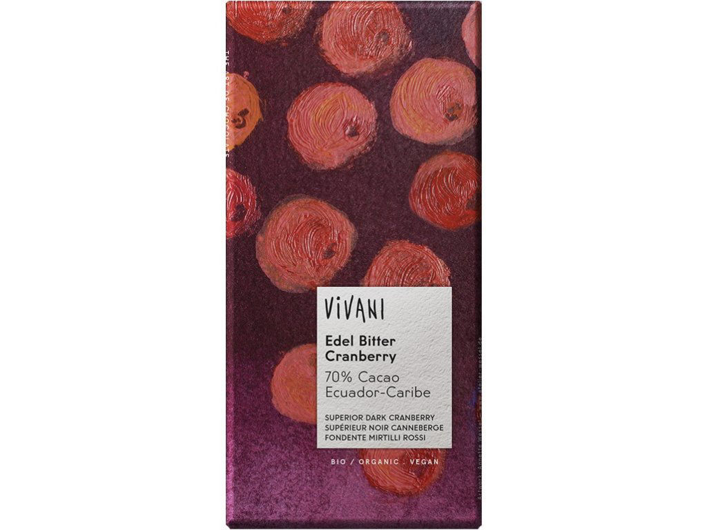 SLOŽENÍ: kakaová hmota, přírodní třtinový cukr, kakaové máslo, sušená brusnice klikva 2,5 %. Všechny suroviny pocházejí z kontrolovaného ekologického zemědělství. Obsah kakaové sušiny nejméně 70 %.