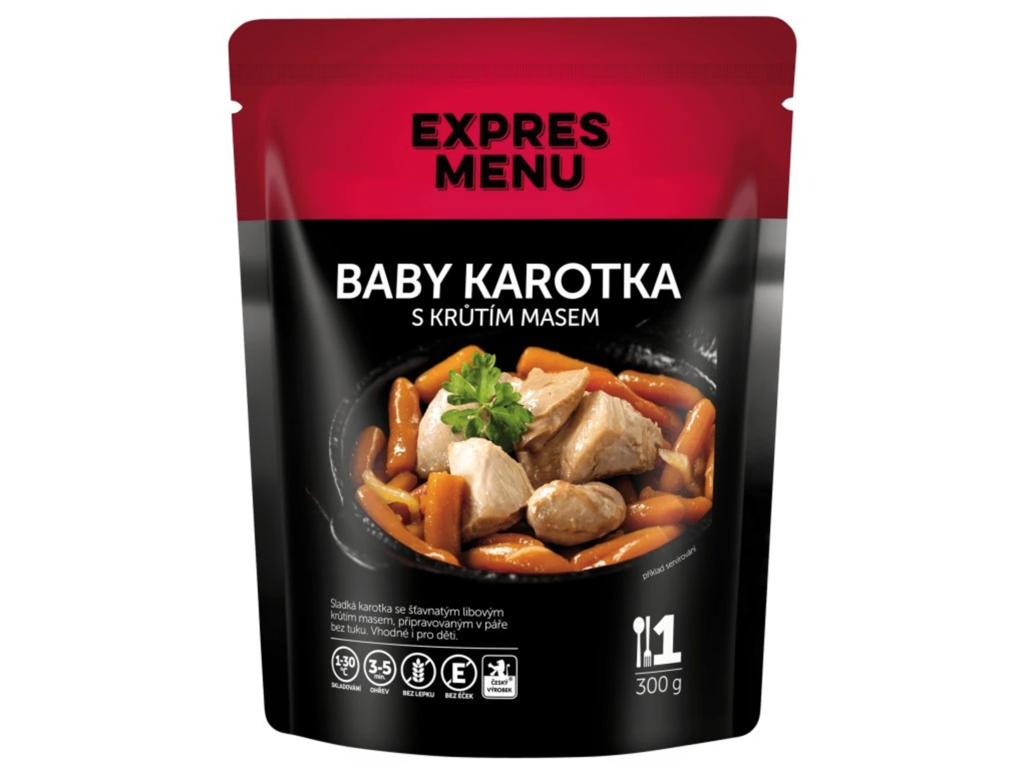 baby karotka (61 %), krůtí maso stehenní (33 %), cibule, sůl kamenná, pepř, kari.