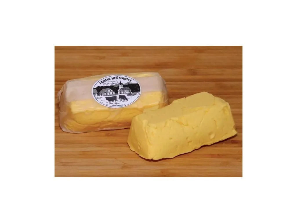 Pro výrobu másla používáme naši 60% smetanu. Máslo je krásně žluté a ucítíte v něm bylinky, které nám tady divoce rostou na pastvinách.