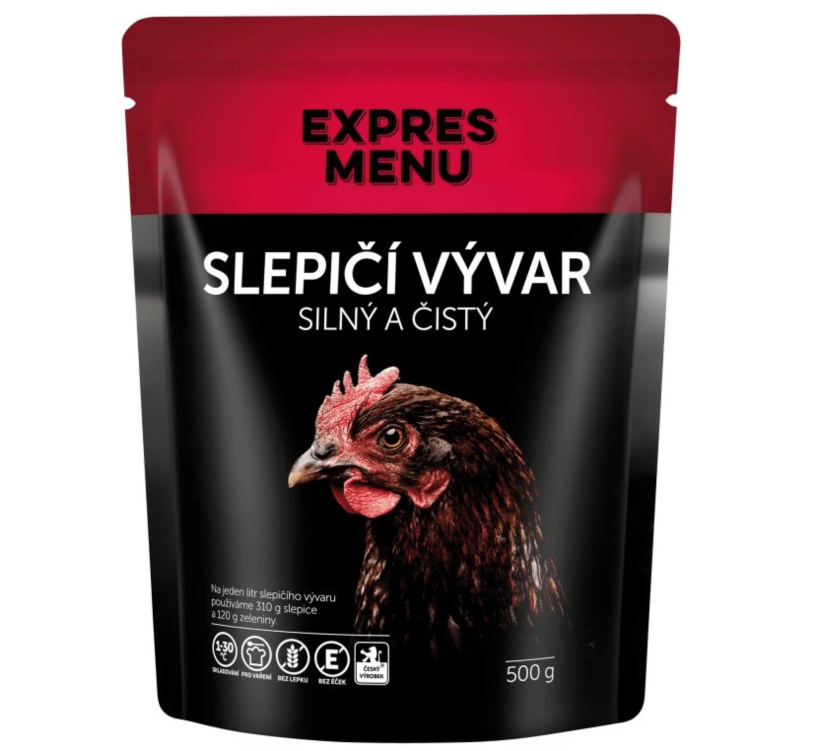 Slepičí vývar (voda, slepice bez drobů, mrkev, petržel, cibule, celer, česnek, sůl kamenná, bobkový list, nové koření, pepř celý).