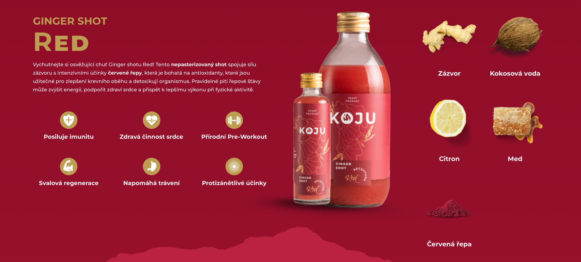 Za studena lisovaná BIO zázvorová šťáva, kokosová voda, za studena lisovaná citronová šťáva, květový med a BIO červená řepa.